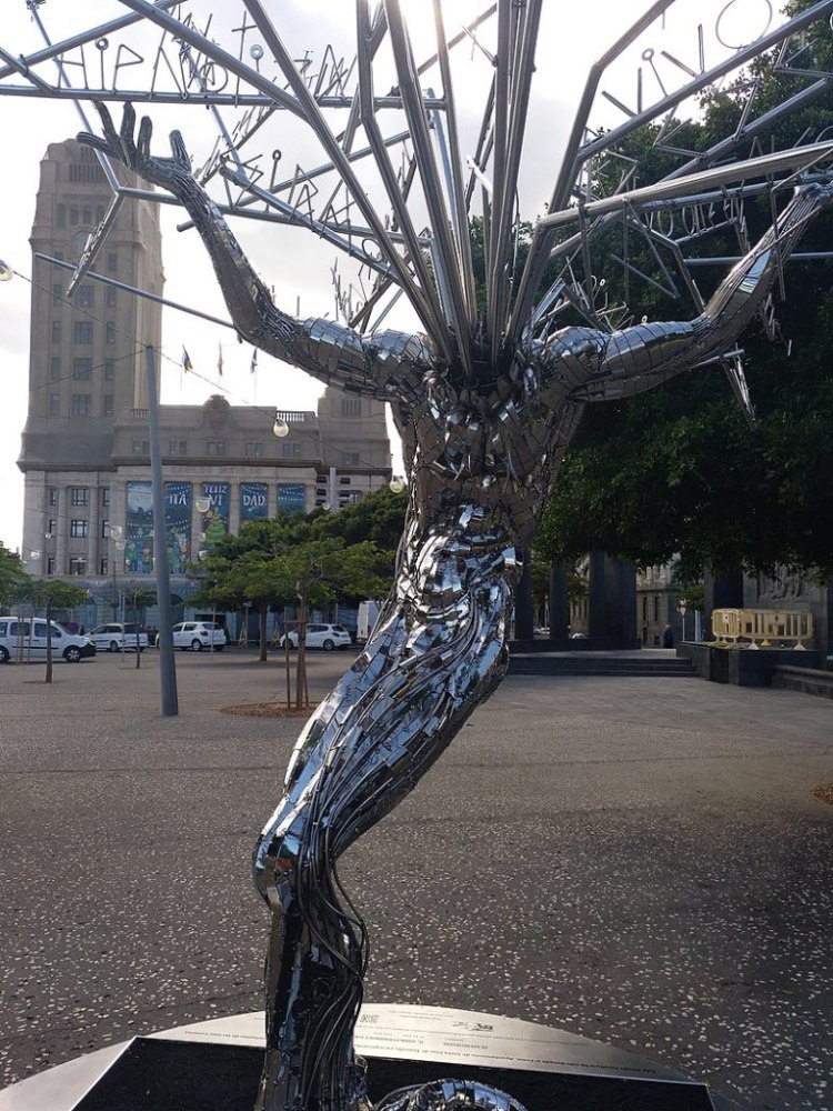 Este peculiar árbol, construido en acero inoxidable, de cinco metros de altura y 450 kilos de peso, forma parte del patrimonio escultórico de Santa Cruz de Tenerife (Islas Canarias) desde diciembre de 2021.